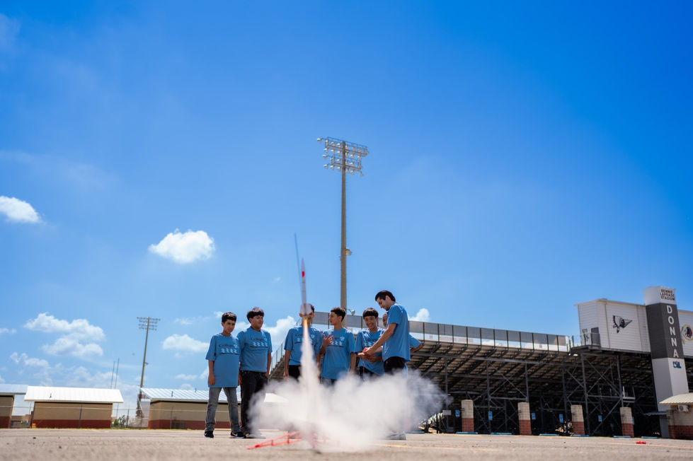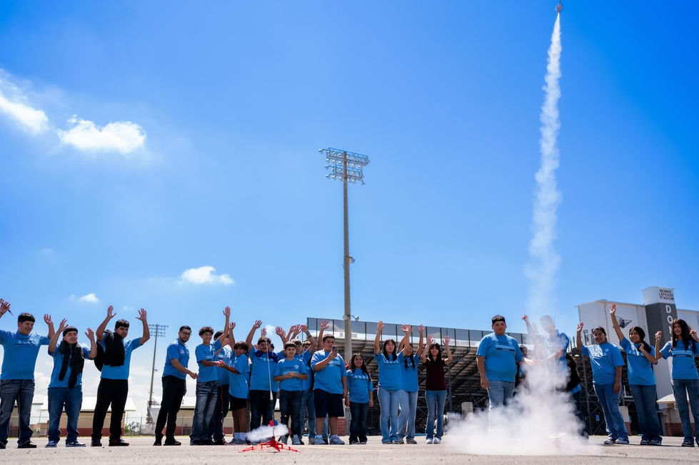 A compilation of images depicting students launching model rockets outdoors under clear blue skies, including setting up and launching the rockets.